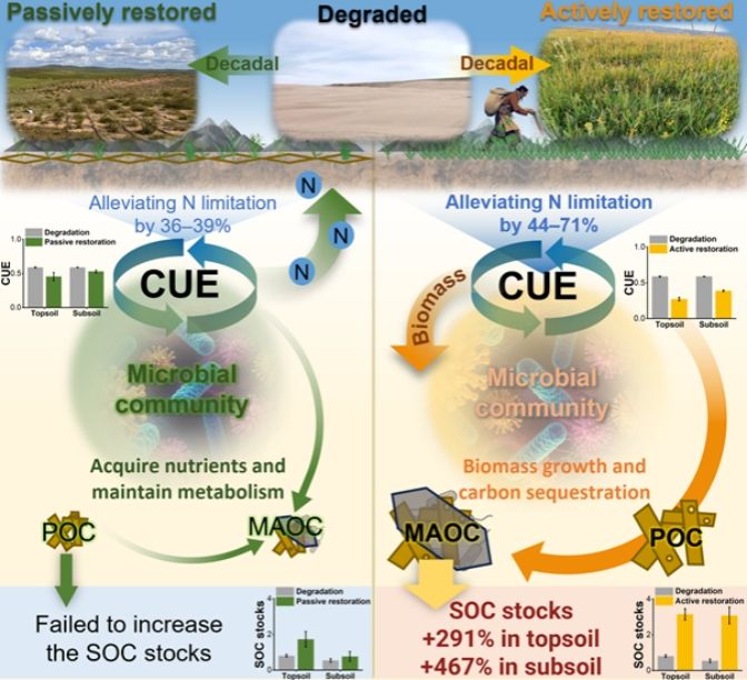 研究进一步指出,主动恢复中豆科植物的固氮作用提高了土壤氮素有效性,改变了微生物的“资源分配策略”,从而推动土壤结构改善和碳积累过程。该成果为高寒退化草地的生态恢复提供了理论依据,也为提升区域土壤碳汇能力、应对气候变化提供了科学参考。